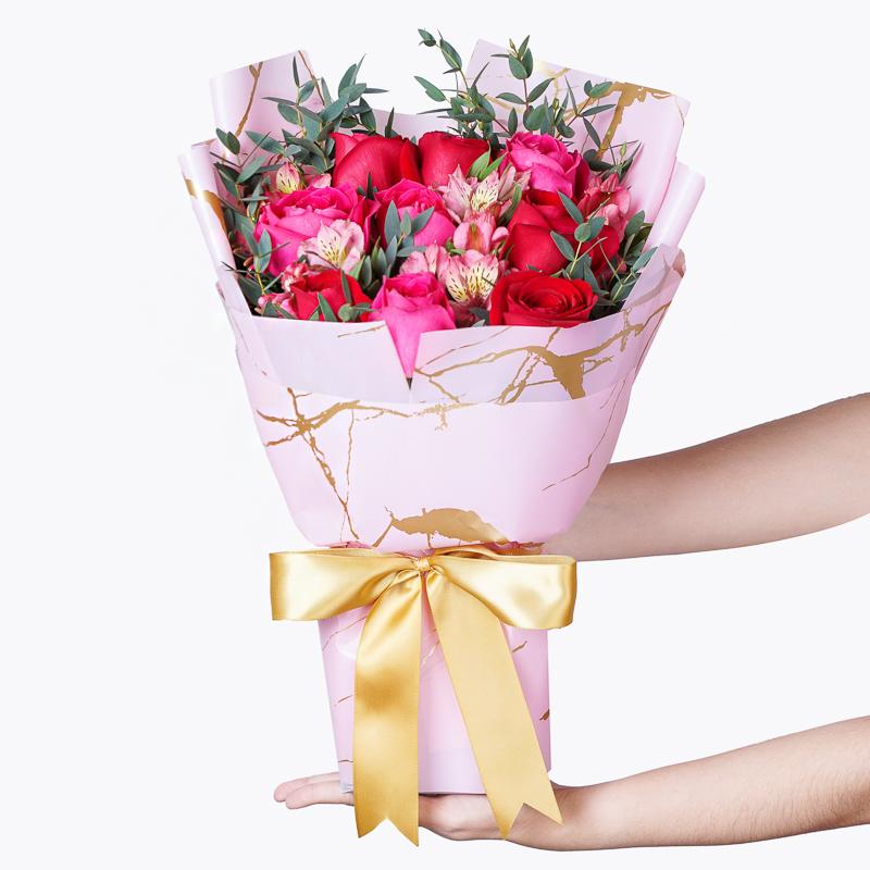 Red Rose (5 Stalks), Shocking Pink Rose (4 Stalks), Pink Alstroemeria (4 Stalks), Eucalyptus Leaves