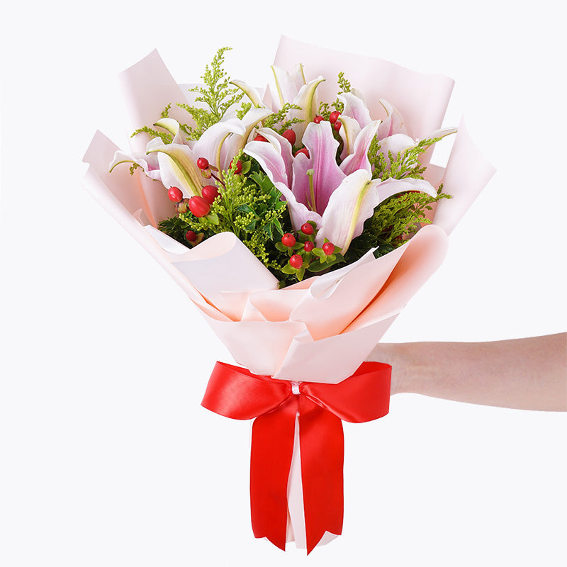 Beautiful pink lilies, decorated with red berries, peacock and tea leaves; our Lovely Lillian flower bouquet is a sweet gesture to make someone's day bright, blooming, and beautiful.