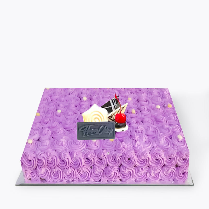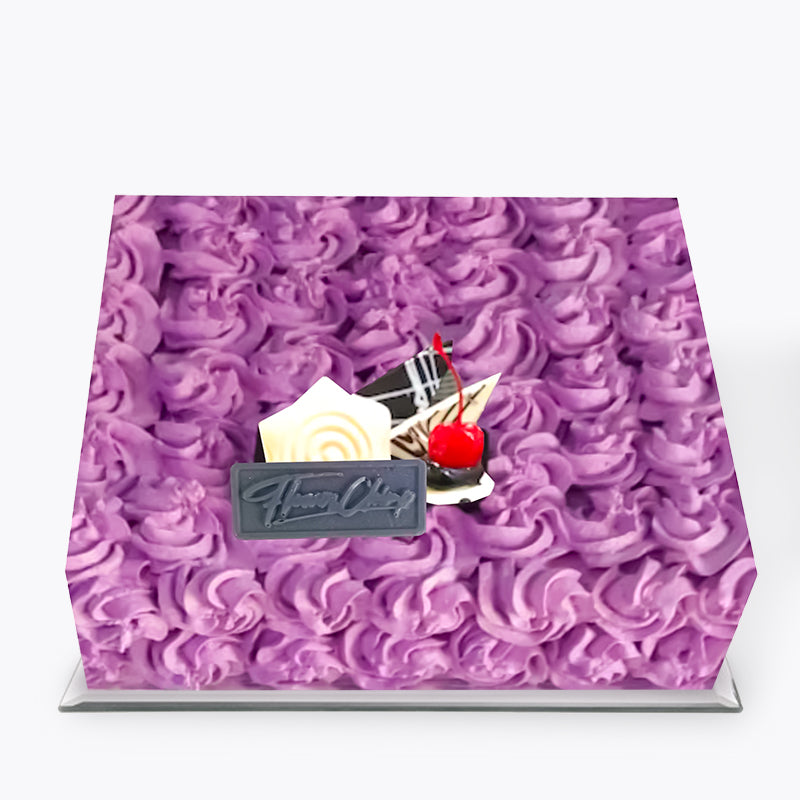Make your surprise sweeter with a cake! 3 layers of chocolate spongecake, cherries, and frosted with whipped cream. With vanilla cream within each layer with cherries covered with the texture shaving of dark chocolate