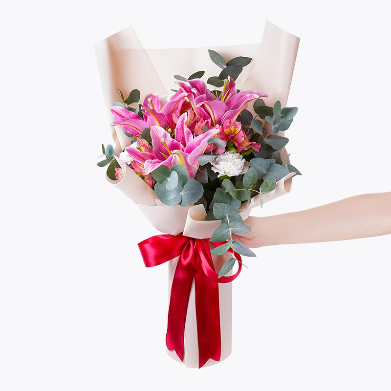 Pink Lilies (1 Stalks), Pink Alstroemeria (3 Stalks), White Carnation (3 Stalks), Eucalyptus Leaves