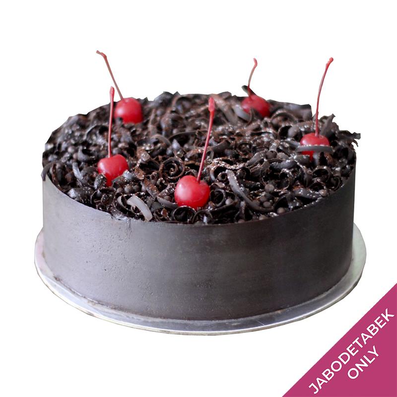 Make your surprise sweeter with a cake! 3 layers of chocolate spongecake, cherries, and frosted with whipped cream. With vanilla cream within each layer with cherries covered with the texture shaving of dark chocolate