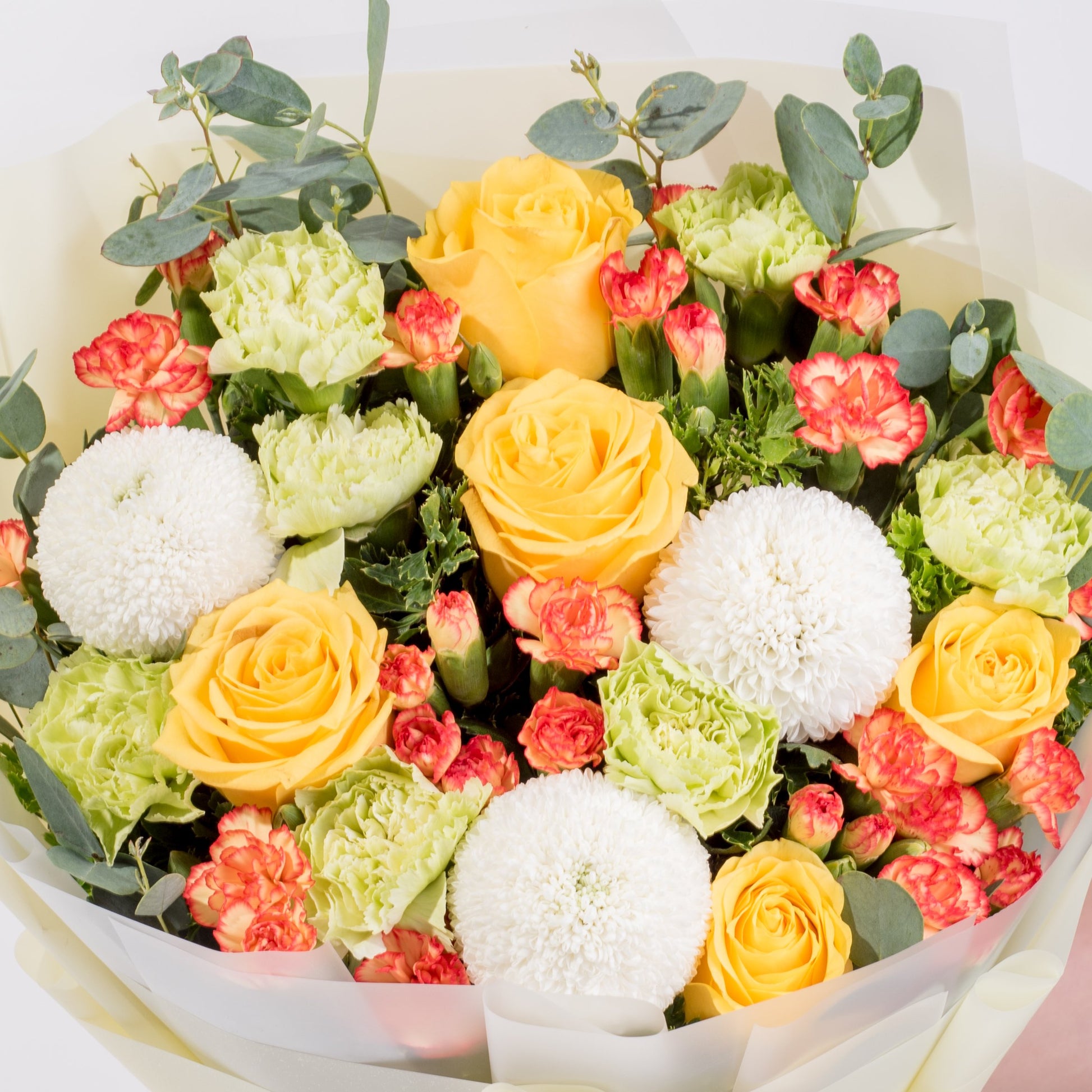 A bright bouquet that gives you a warm feeling on the inside as it arranged with white ping pongs, green carnations, 2-tone yellow and orange carnation sprays, and yellow roses. - This bouquet will express your love and appreciation for simply any occasion that you may have in mind.