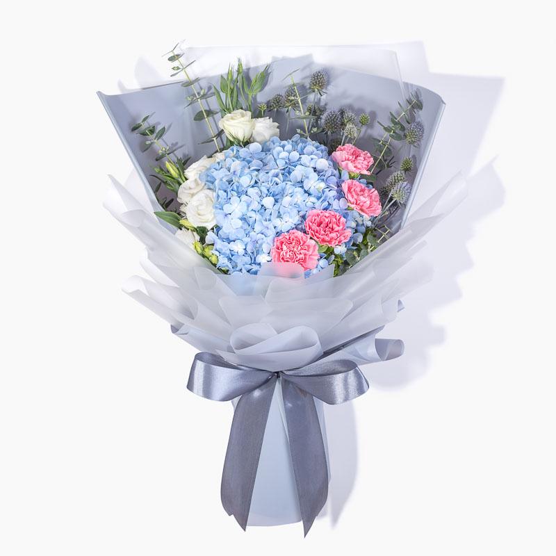 A dreamy flower bouquet that expresses your love and affection. This bouquet leave your special person daydreaming with the light blue hydrangeas, carnations, white eustomas and eryngium carefully and perfectly arranged.