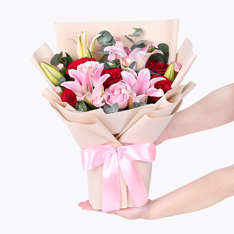 Red Roses (5 stalks), Pink Lily (2 Stalks), Pink Roses (3 Stalks), Pink Carnation Sprays (2 Stalks), Eucalyptus Leave