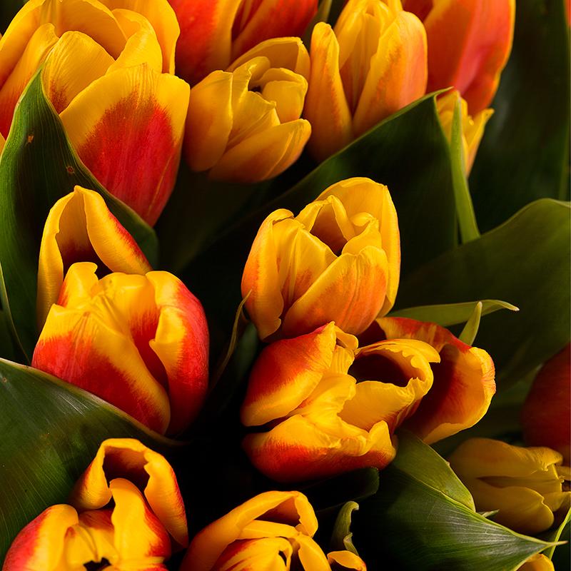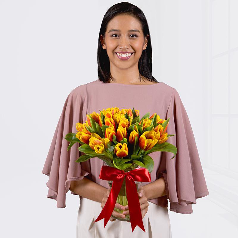 A bouquet of dashing two-tone yellow-orange tulips accompanied by cordylines. - This arrangement is the perfect reminder to your loved one of their beauty and grace - a gift that will light up the atmosphere of the room whilst it represents your love and admiration.