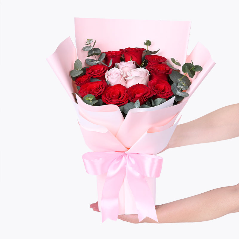 Light Pink Rose (3 Stalks), Red Rose (10 Stalks), Eucalyptus Leaves