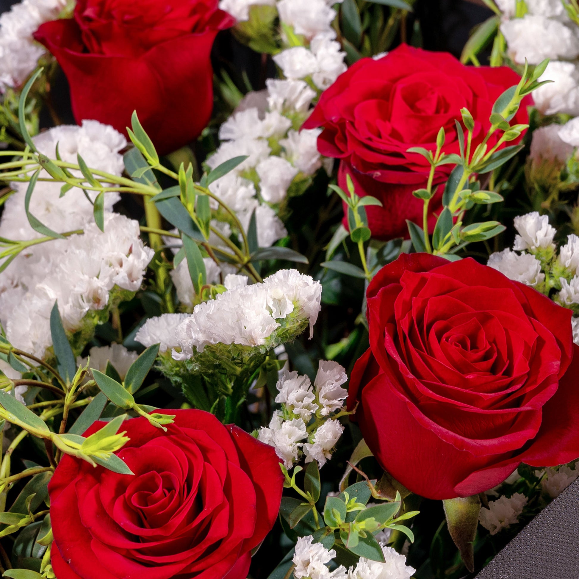 A symbol of love and admiration, Pure Romance speaks volumes without saying a word. Featuring 5 red roses that embody heartfelt devotion, paired with delicate white statice and lush parvifolia eucalyptus, this bouquet beautifully captures timeless affection with simple elegance.
