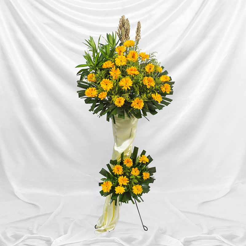 The Standing Bellvanya is a versatile arrangement featuring yellow gerberas, complemented by an array of elegant palm leaves. Its stature allows it to stand out in any setting, offering a symbol of solidarity and respect. Whether it’s to celebrate life’s milestones or to offer comfort in times of sorrow, this arrangement carries a dignified presence.