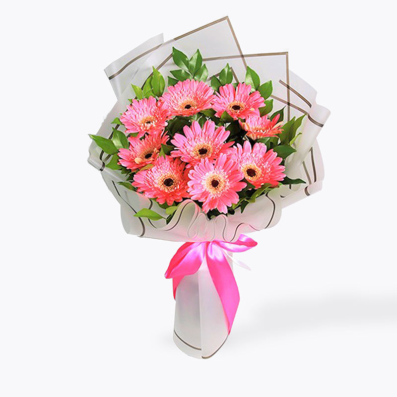 Light Pink Carnation (2 Stalks), Shocking Pink Carnation (3 Stalks), Pink Rose (2 Stalks), White Peacock
