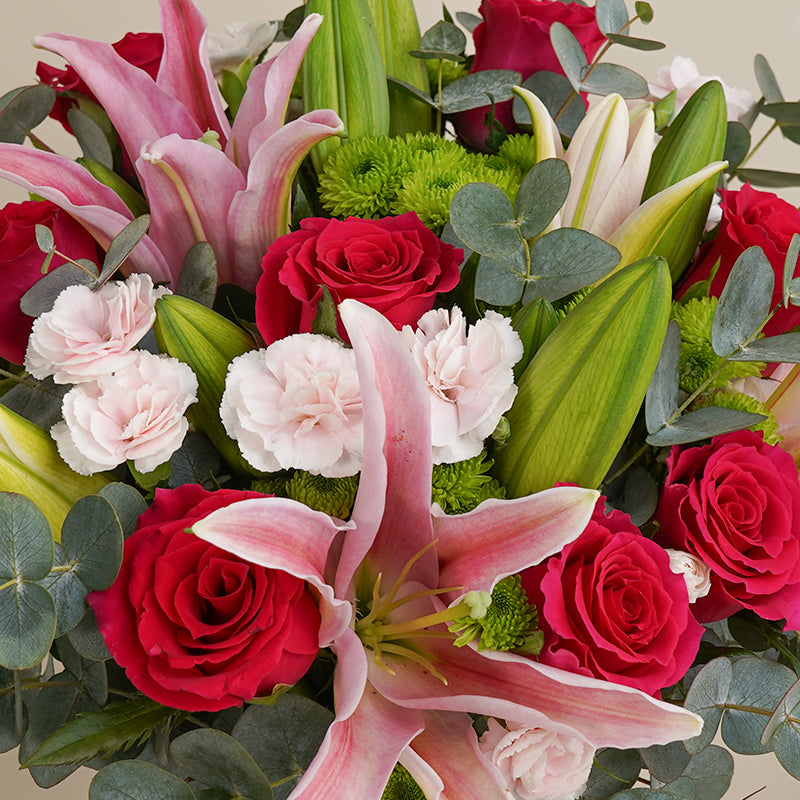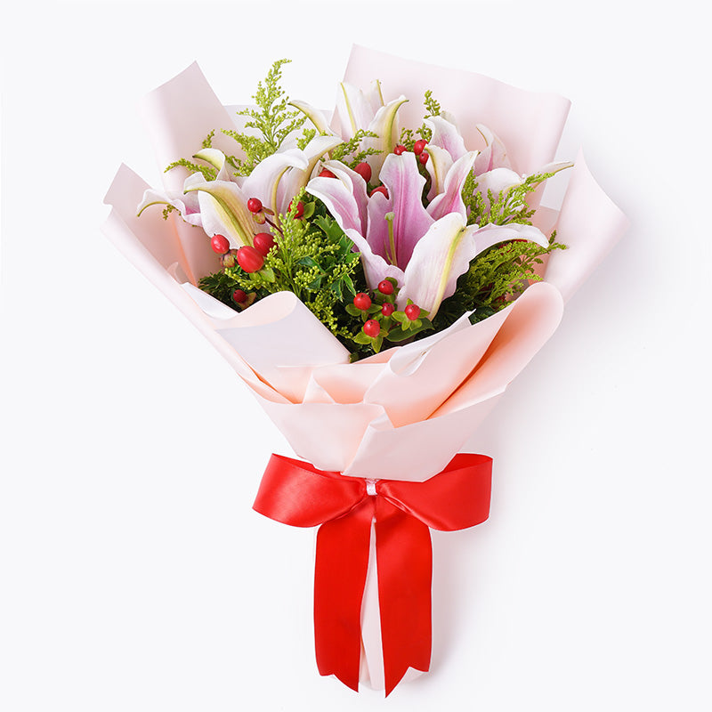 Pink and yellow roses, white Lilies, a beautiful combination of meaningful flowers. Pink pink roses found in this series are often interpreted as admiration and tenderness, but can also be used as expressions of sympathy. Yellow roses are sun-filled flowers that give meaning to warmth, fun and feeling. While traditionally, the meaning of Gerbera Daisy is pure bliss. Choose your shipping date in your shopping cart and we will send your message!