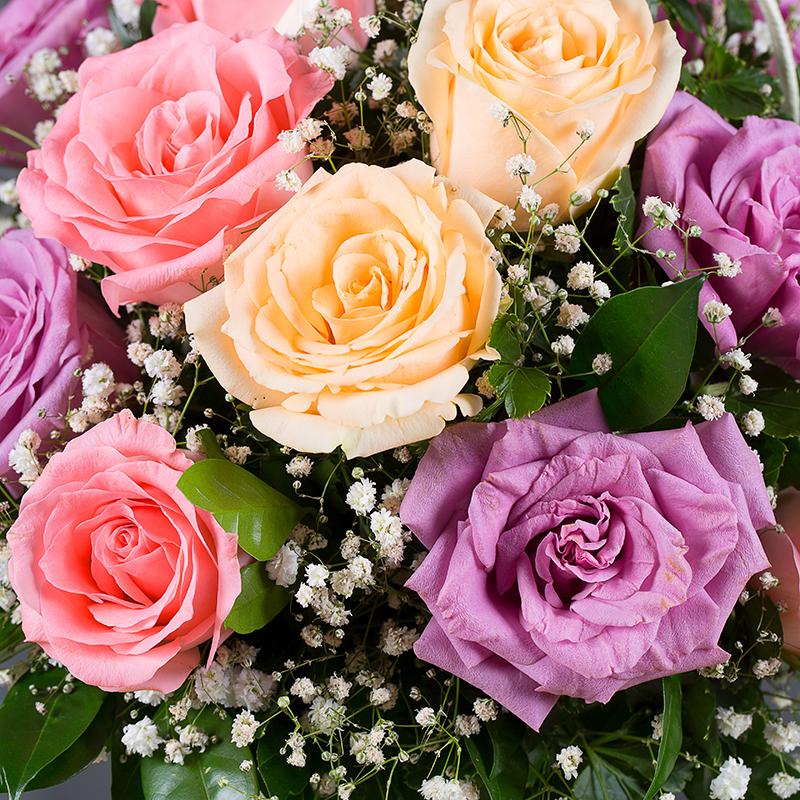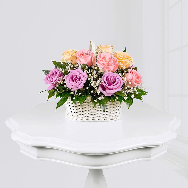 This gorgeous basket will make anyone's day! Sweet pink, champagne, and purple roses arranged in a classic white basket make this arrangement the perfect gift for all occasions!