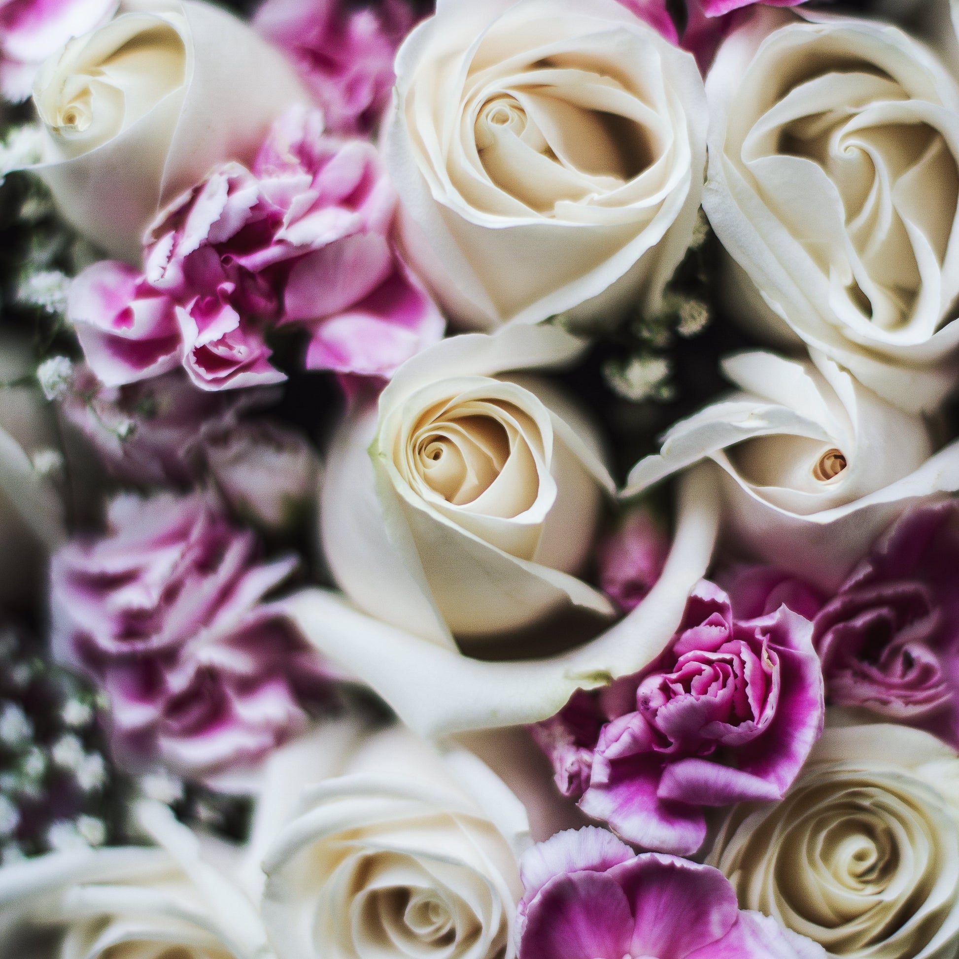 Cream Rose (18 stalks), Pink Carnation Spray (3 stalks), White Baby Breath