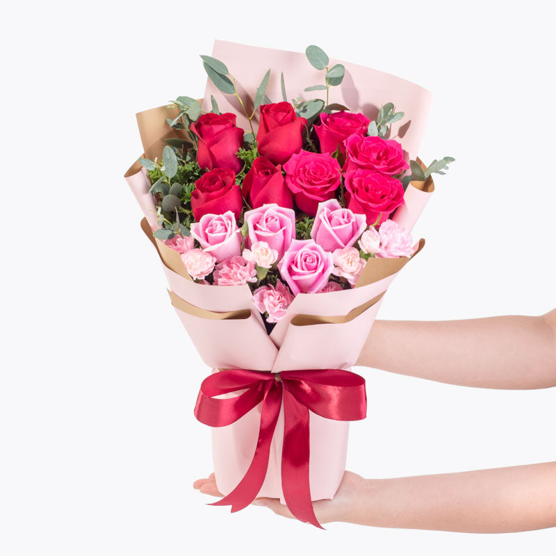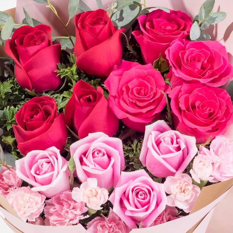 Red Roses (4 Stalks), Shocking Pink Roses (4 Stalks), Maria Pink Roses (4 Stalks), Pink Carnation Spray (2 Stalks), Eucalyptus Leaves