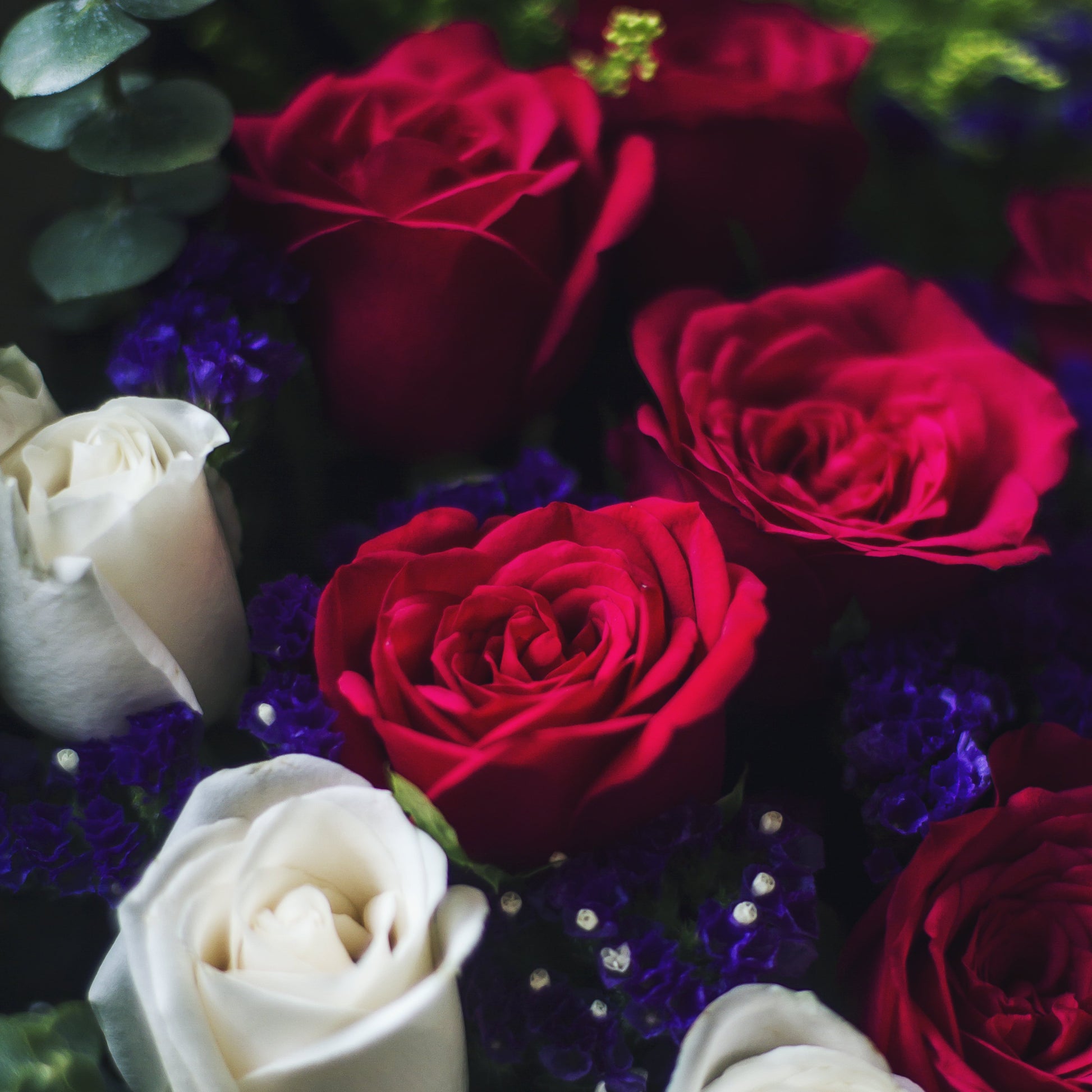 Red Rose (7 Stalks), White Rose (3 Stalks), Purple Statice (3 Stalks), Yellow Peacock, Eucalyptus Leaves