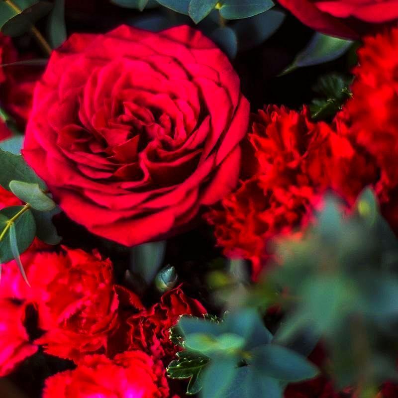 Red Carnation (4 Stalks), Red Rose (3 Stalks), Red Carnation Spray (2 Stalks), Eucalyptus Leaves