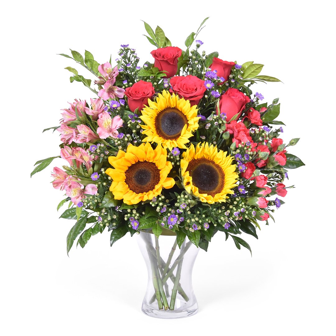 Red Rose (5 stalks), Sunflower (3 stalks), Pink Alstroemeria (4 stalks), Red Carnation Spray (3 stalks), Purple Peacock