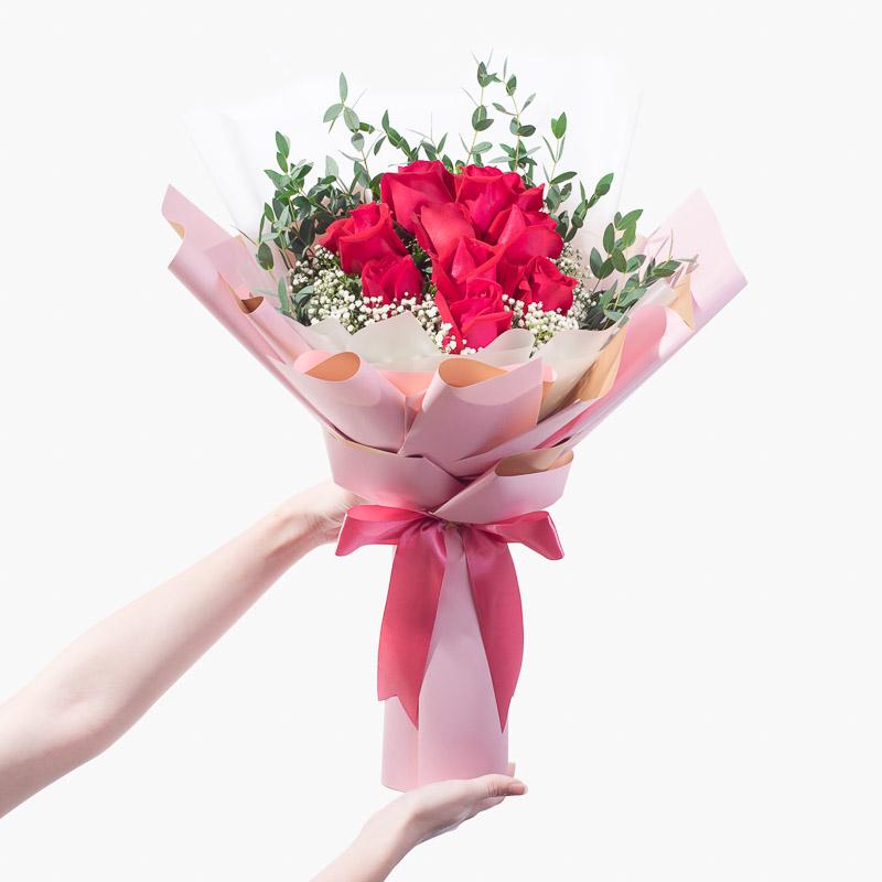 Red Rose (9 stalks), White Baby Breath, Eucalyptus Leaves