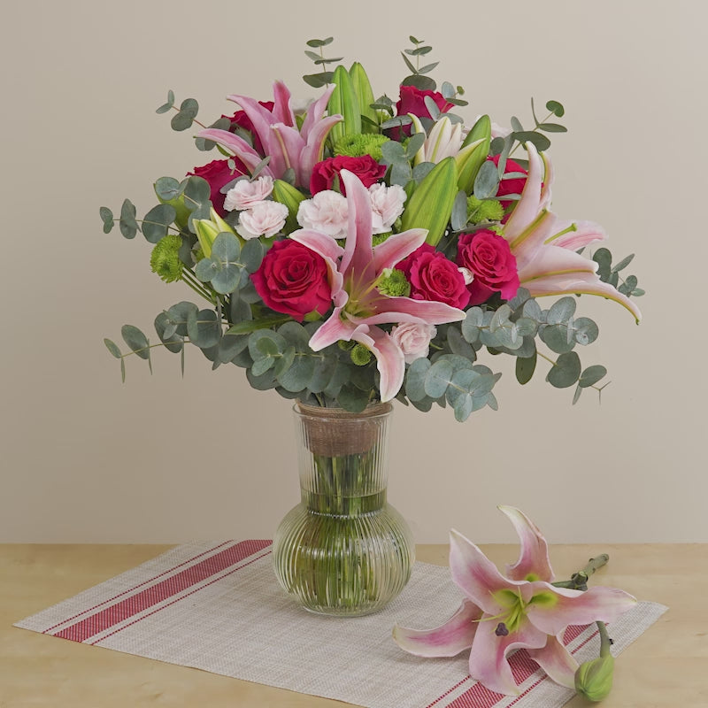 Shocking Pink Rose (8 Stalks), Pink Lily (4 Stalks), Pink Carnation Spray (3 Stalks), Green Button (5 Stalks)