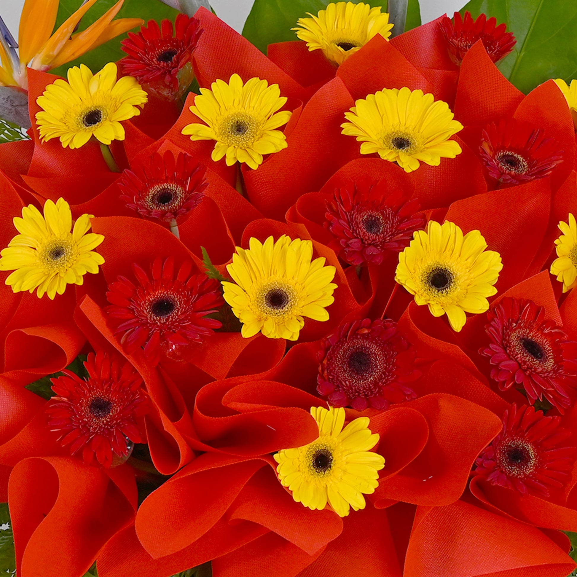 Red Gerbera (10 Stalks), Yellow Gerbera (10 Stalks), Orange Bird of Paradise (3 Stalks)