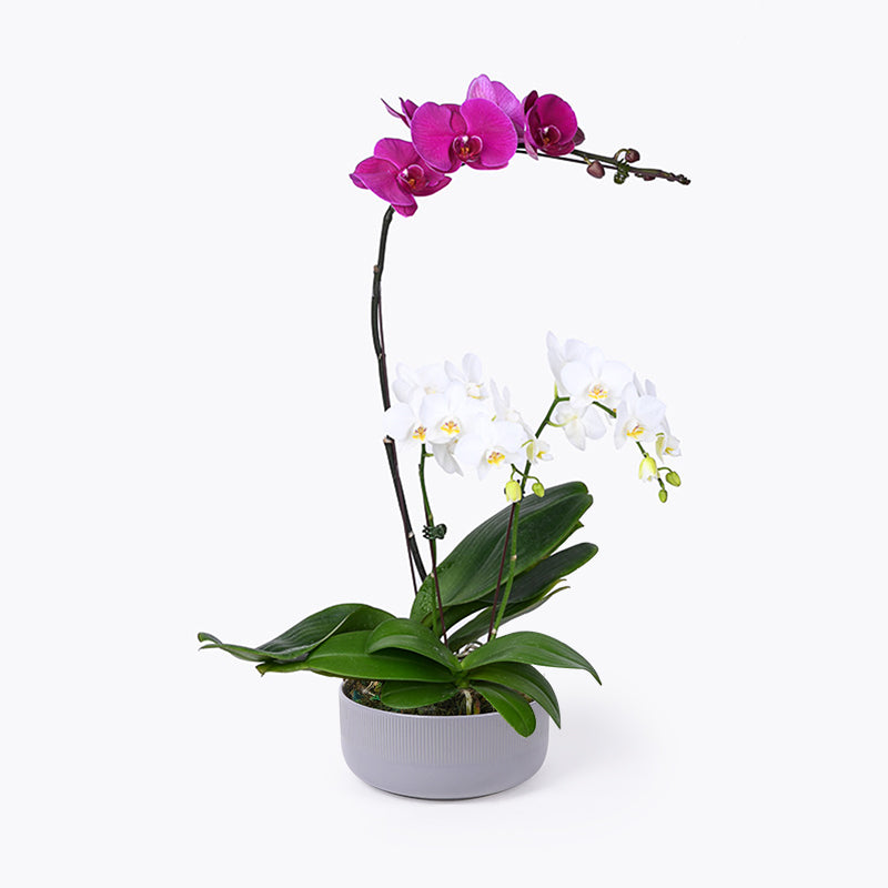Flourishes of pearly whites, paired together with gleaming pink blooms - our Magenta Melange potted Orchid brings you a medley of royal hues, brought to you in a sophisticated marbled pot.