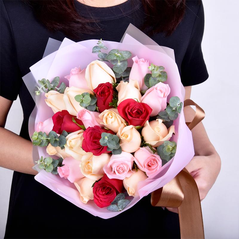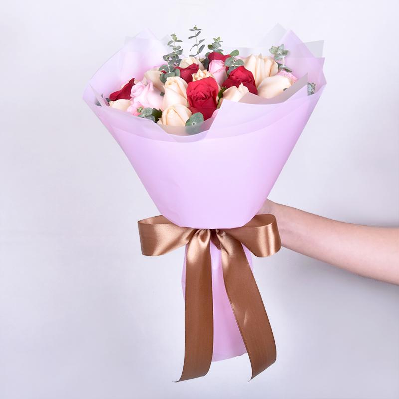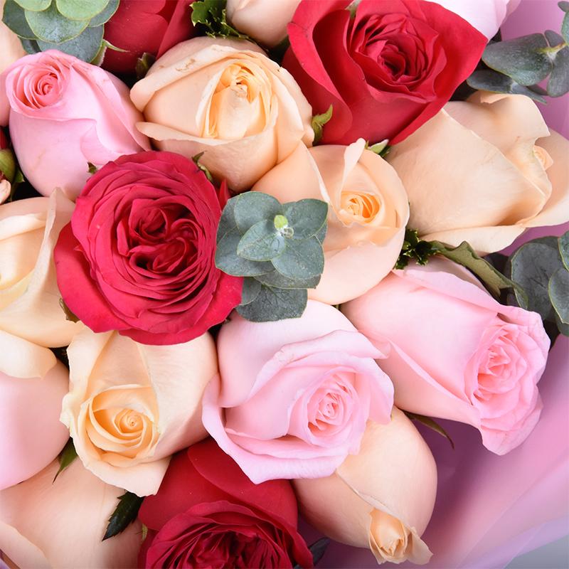Red Rose (5 stalks), Light Pink Rose (8 stalks), Champagne Rose (12 stalks), Eucalyptus Leaves