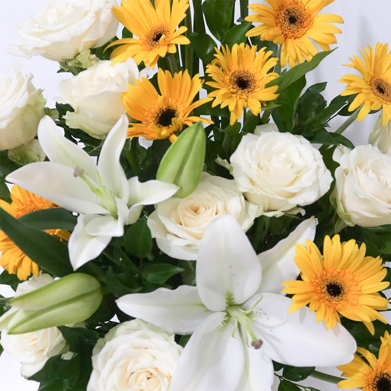 Yellow Gerberas (13 Stalks), White Roses (9 Stalks), White Lily (1 Stalk)