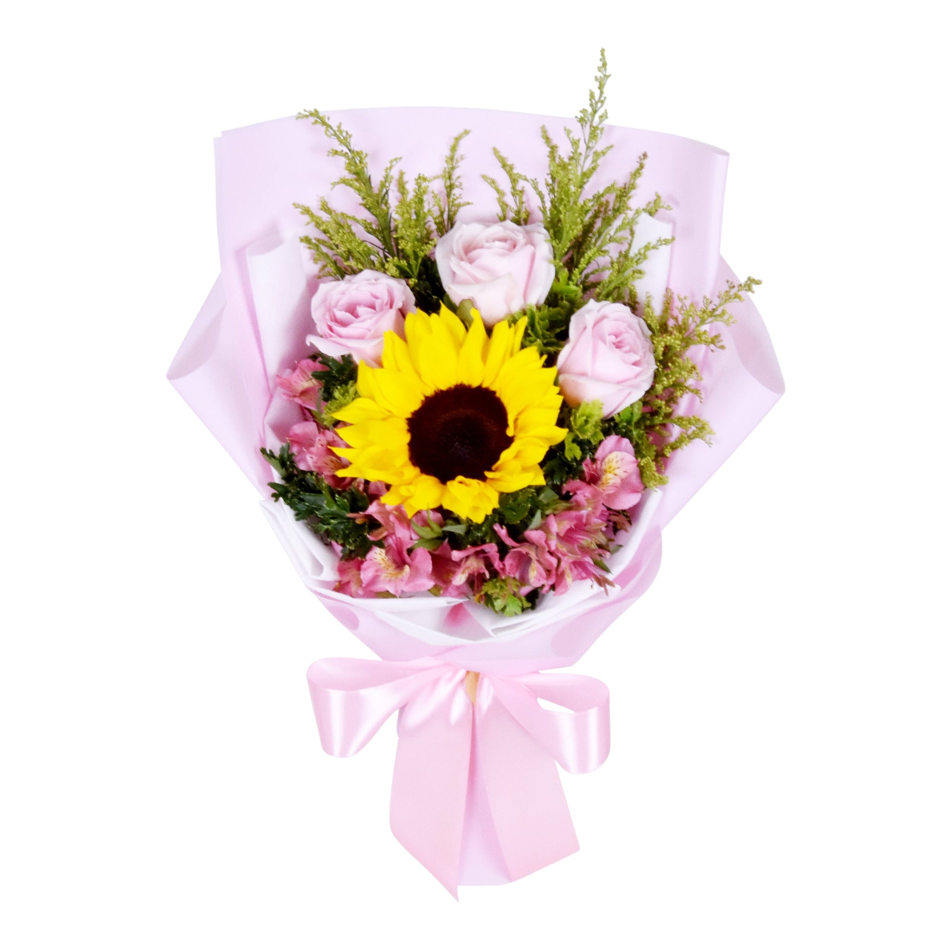 Light Pink Rose (3 Stalks), Sunflower (1 Stalk), Pink Alstroemeria (3 Stalks), Yellow Peacock