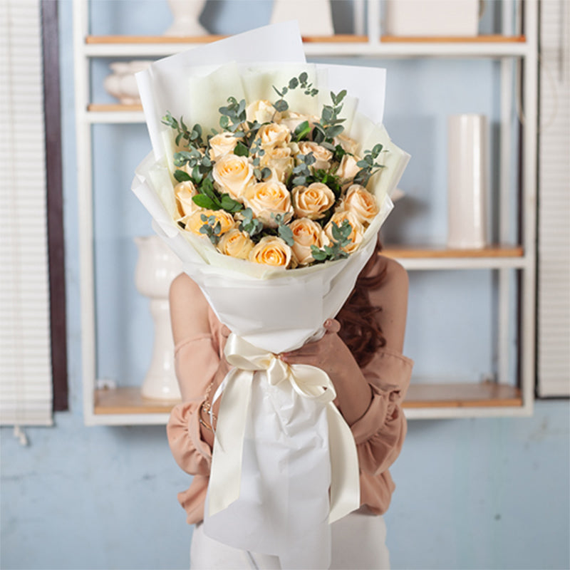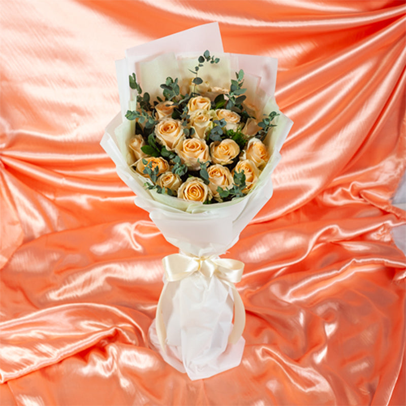 Tessa is a bouquet that captures the essence of a serene sunset with its 12 peach roses. The gentle embrace of tea leaves and the whisper of eucalyptus baby blue complete the picture, creating a peaceful floral retreat. Bring Tessa into your home or share the calm with someone special.