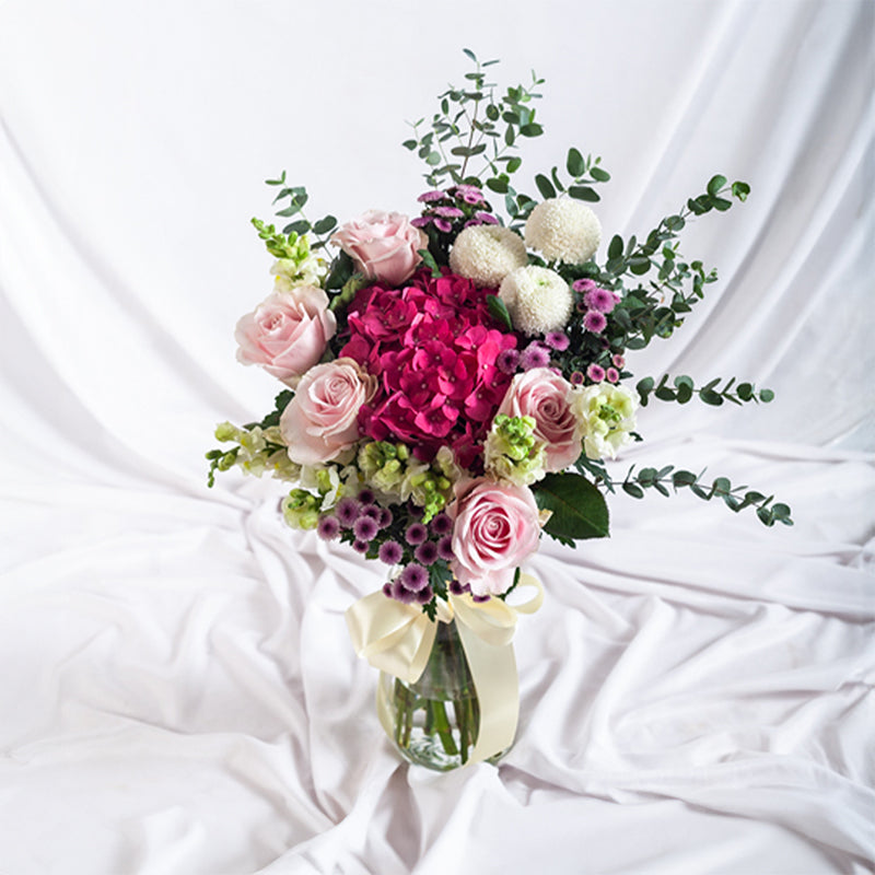 Sweet Pink Roses (5 Stalks), White Pingpong (3 Stalks), Shocking Pink Hydrangea (1 Stalk), Snapdragon (5 Stalks), Pink Daisy (3 Stalks), Eucalyptus Baby Blue (4 Stalks)