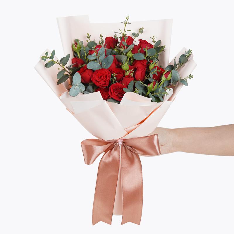 A petite arrangement of ravishing spray red roses, decorated with sprays of eucalyptus gunny. Our Lovesong mini bouquet is the perfect little gesture to make your darling blush like never before.