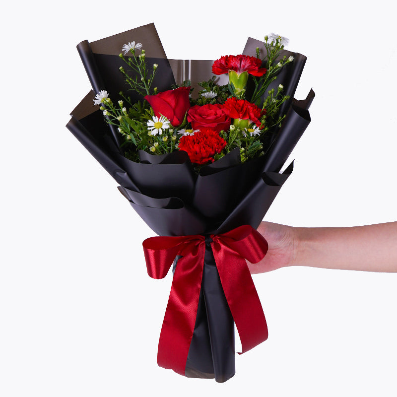 Red Carnation (3 stalks), Red Rose (2 stalks), White Aster