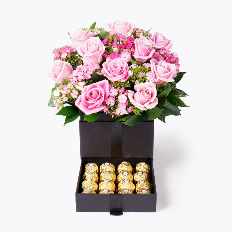 Flourish into the feeling of love with bashful pink maria roses and sweet william, adorned with tea leaves and ruscuses. Our enchanting Aphrodite Trinity Box is sure to ravish you, and sweep you off your feet with every beautiful bloom.