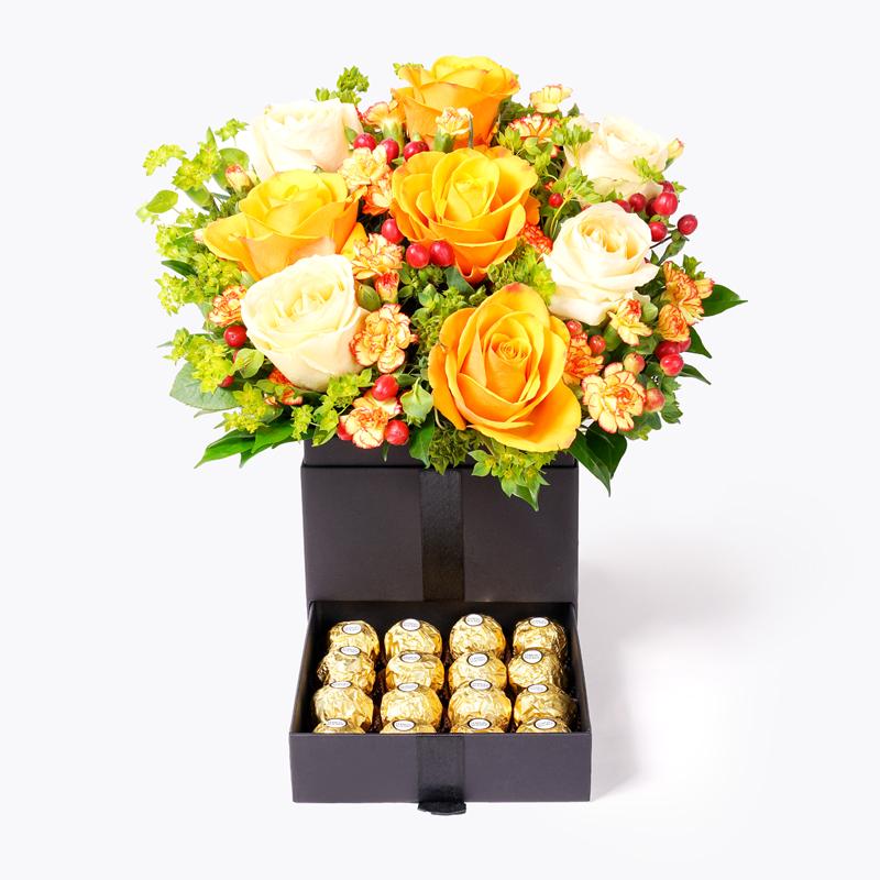 Blooming with brilliant 2 tone yellow orange carnation sprays, amber and champagne roses, this blossoming arrangement is accompanied with red berries, bupleurum and tea leaves. Bring home the essence of Athena with our marvelous Athena Trinity Box.