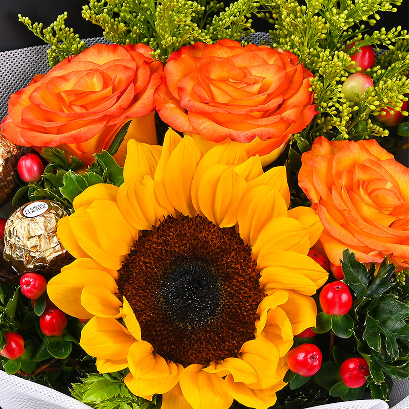 Orange Roses (3 Stalks), Sunflower (1 Stalk), Red Berry (2 Stalks), Yellow Peacock, Ferrero Rocher (2 pieces)