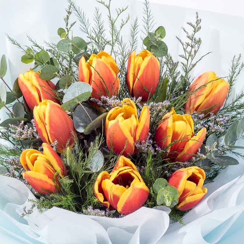 Two-Toned Orange Tulips (10 Stalks), Blue Caspia, Eucalyptus Leaves
